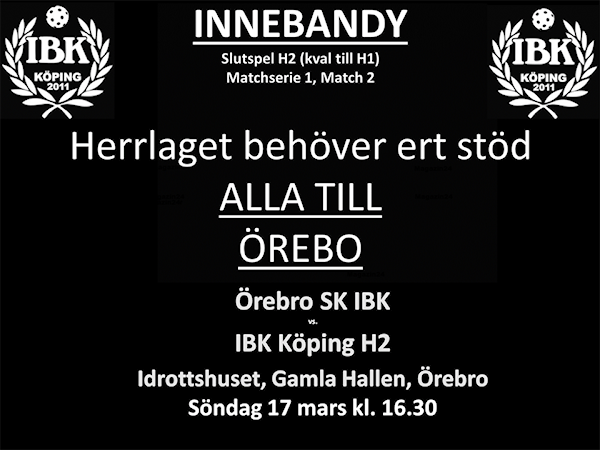 På söndag 17/3 kl 16.30 spelas match 2 i matchserie 1 i kvalet till H1 i Örebro (Idrottshuset, Gamla Hallen).
