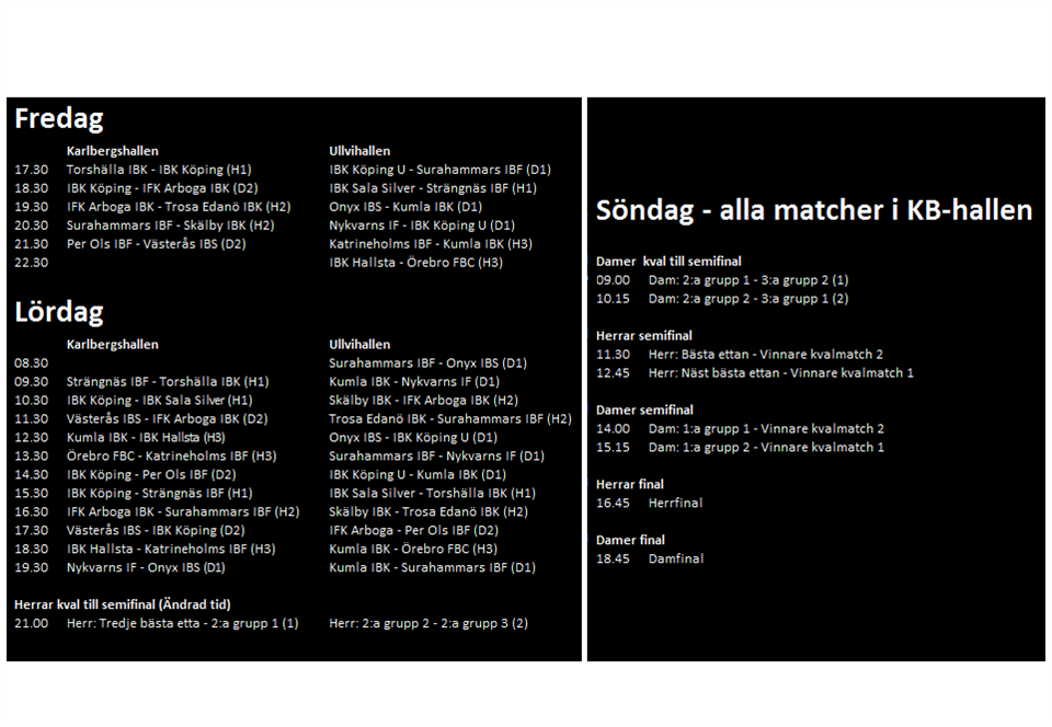 Ikväll (fredag) inleds Sverigespelen här hemma i Köping och herrarna har hamnat i grupp 1 tillsammans med IBK Sala Silver, Torshälla IBK och Strängnäs IBF. Två division 2-lag och ett från division 3 borde betyda att avancemang från gruppspelet finns inom räckhåll, men som alltid så ska det spelas om det också. Laget matchar enligt följande i gruppspelet: Fredag 17.30 mot Torshälla IBK Lördag 10.30 mot IBK Sala Silver Lördag 15.30 mot Strängnäs IBF Alla matcher i Karlbergshallen Eventuellt slutspel inleds på lördag kväll. Håll utkik på www.sverigespelen.se för att se hur det går för laget i turneringen.