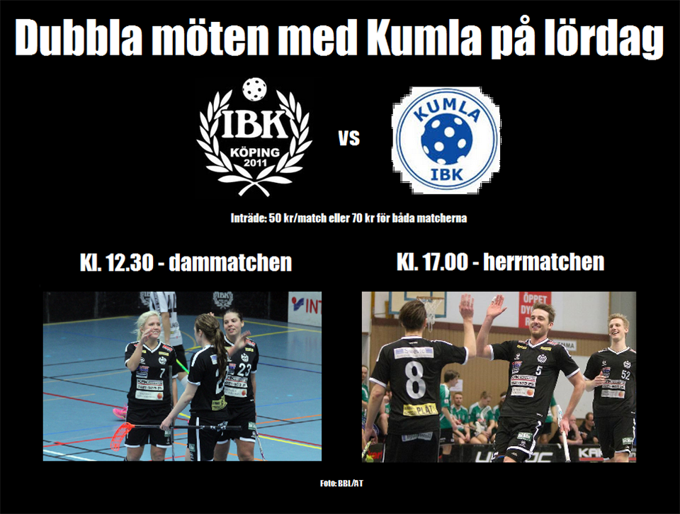 Spänningen stiger...missa inte en intensiv och spännande innebandydag på lördag i KB-hallen! IBK Köping möter Kumla i både dam- och herrettan. Damernas kamp för att säkra fortsatt kontrakt i div 1 fortsätter och vid seger är spel i div 1 klart till nästa säsong. Herrarna spelar för att nå kvalplatsen som kan leda till spel i Allsvenskan till nästa säsong. Nu fyller vi läktaren och hejar fram våra lag till SEGER! Klubben hälsar er alla varmt välkomna där det som vanligt bjuds på fika och naturligtvis riktigt skön innebandy. Lördag 7/3 Damer div 1 kl 12:30 Herrar div 1 kl 17:00 Våra Herr- och damspelare hälsar er välkomna! Herrar Div 3/HJ 6 mar 2015 0kommentarer